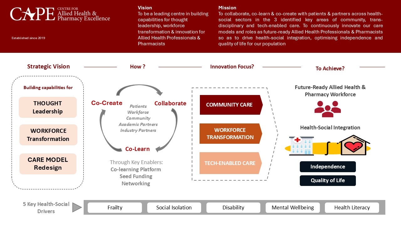 Centre for Allied Health and Pharmacy Excellence (CAPE) is a strategic platform to further innovation efforts in Allied Health and Pharmacy.